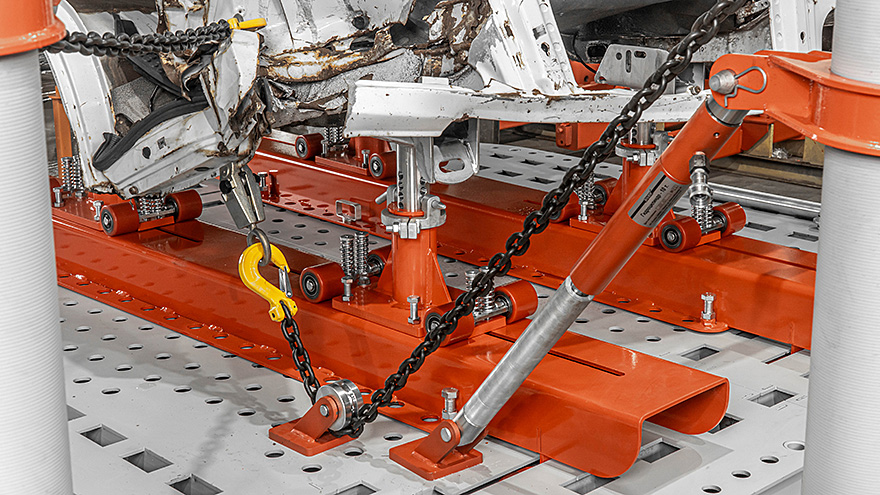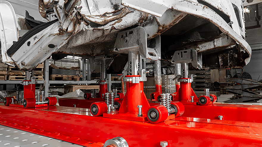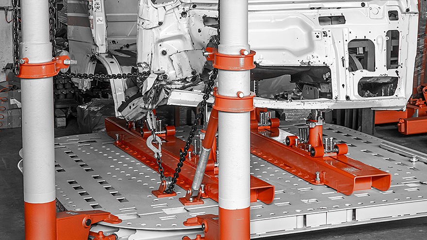 Силовые устройства башенного типа высотой 3 м оснащены гидроцилиндрами 10 т и позволяют быстро и эффективно восстановить геометрию вертикальных элементов каркаса и крыши кабины. Для управления силовыми устройствами используются пневмогидравлические насосы.